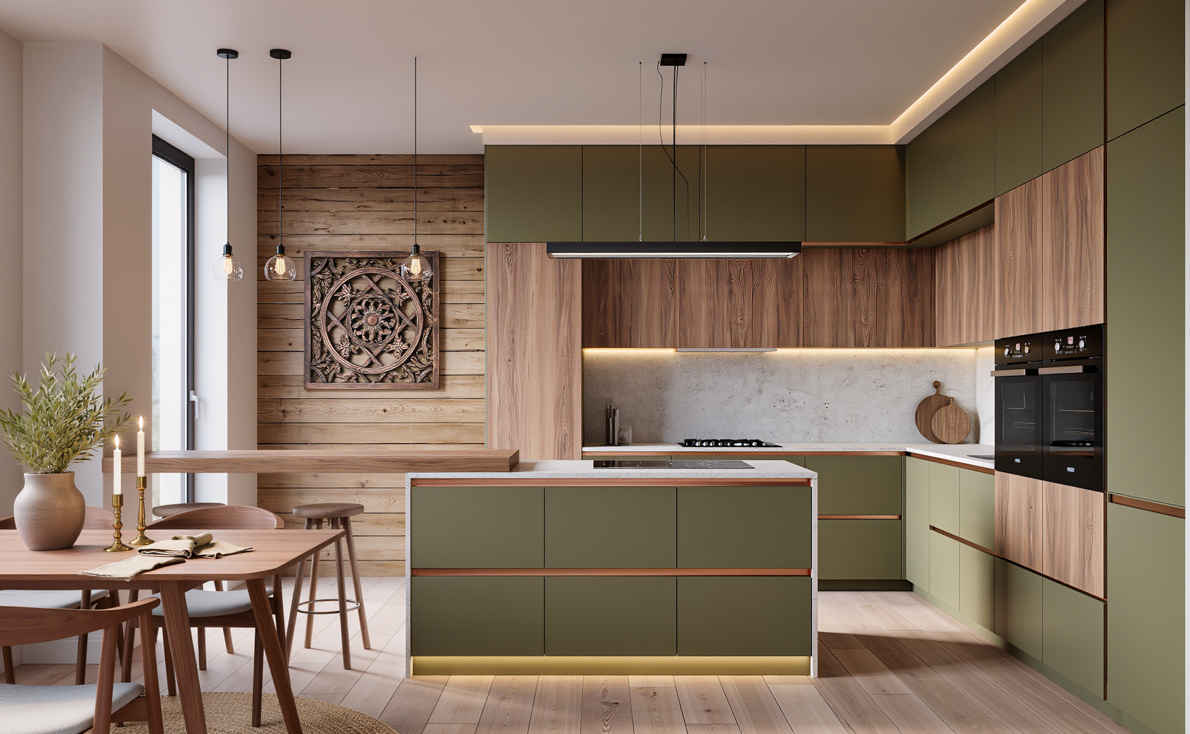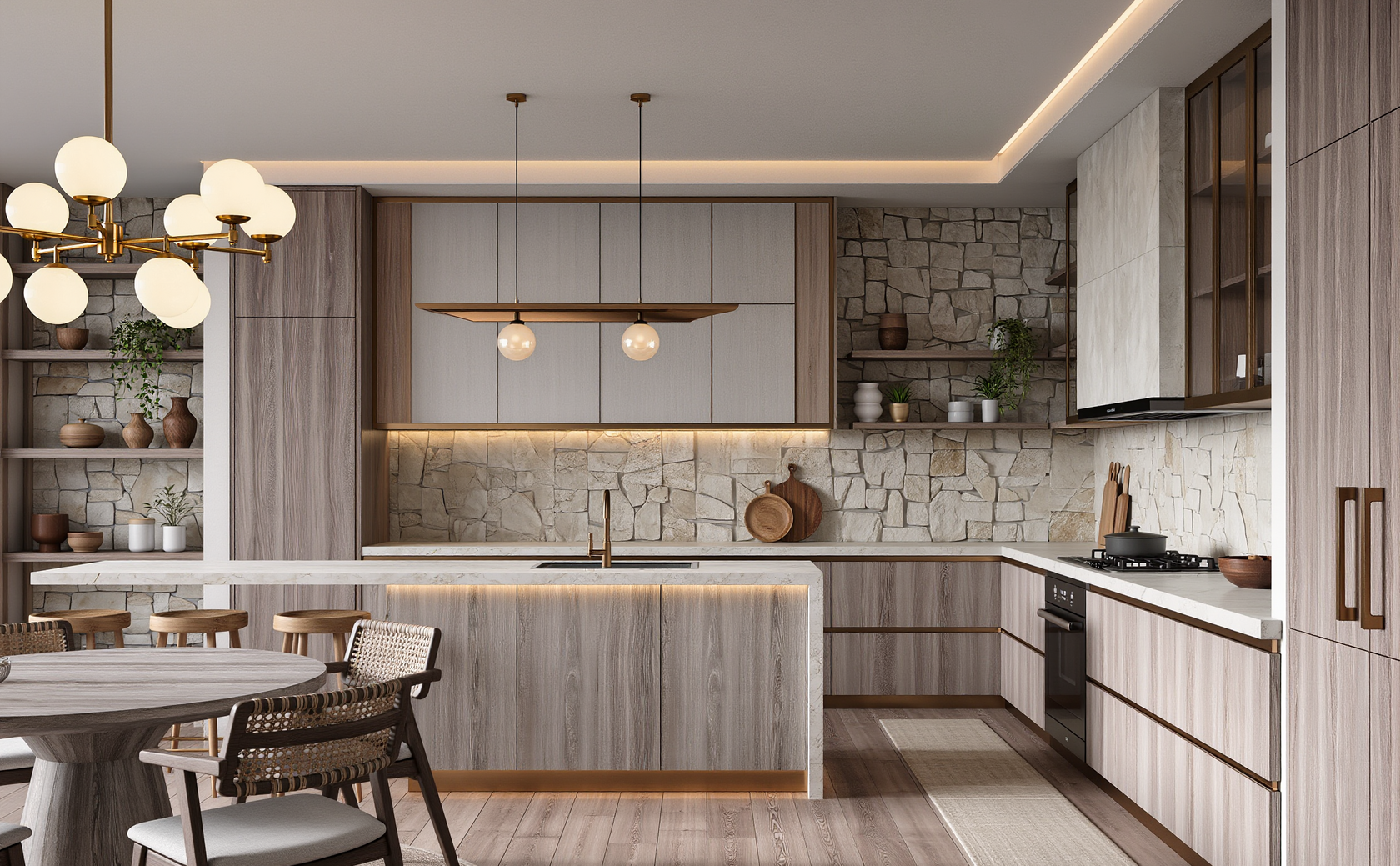 Материалы с аутентичной фактурой, матовые поверхности и природные оттенки создают атмосферу гармонии и спокойствия.