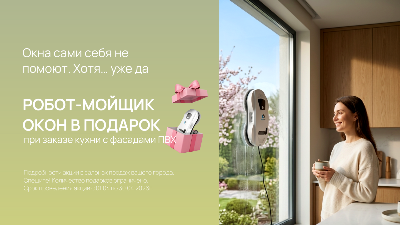 Только до 30 апреля при заказе кухни с фасадами ПВХ вы получаете полезный подарок — робот-мойщик окон, который возьмёт на себя заботу о чистоте в доме.